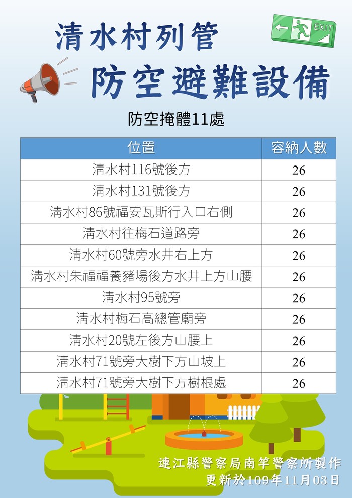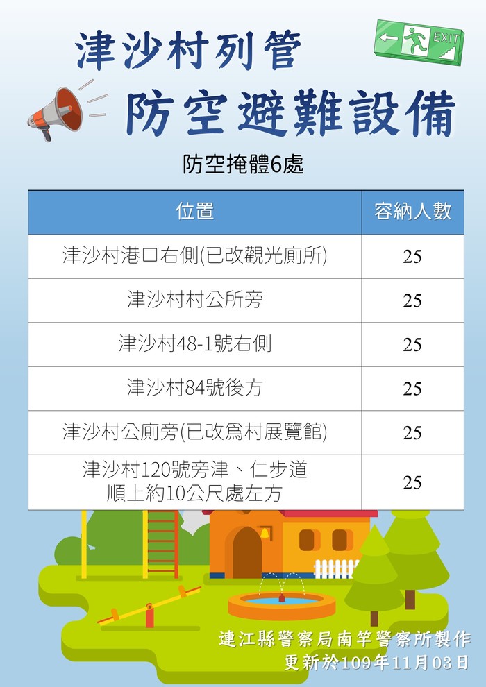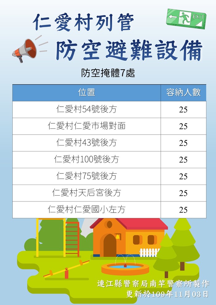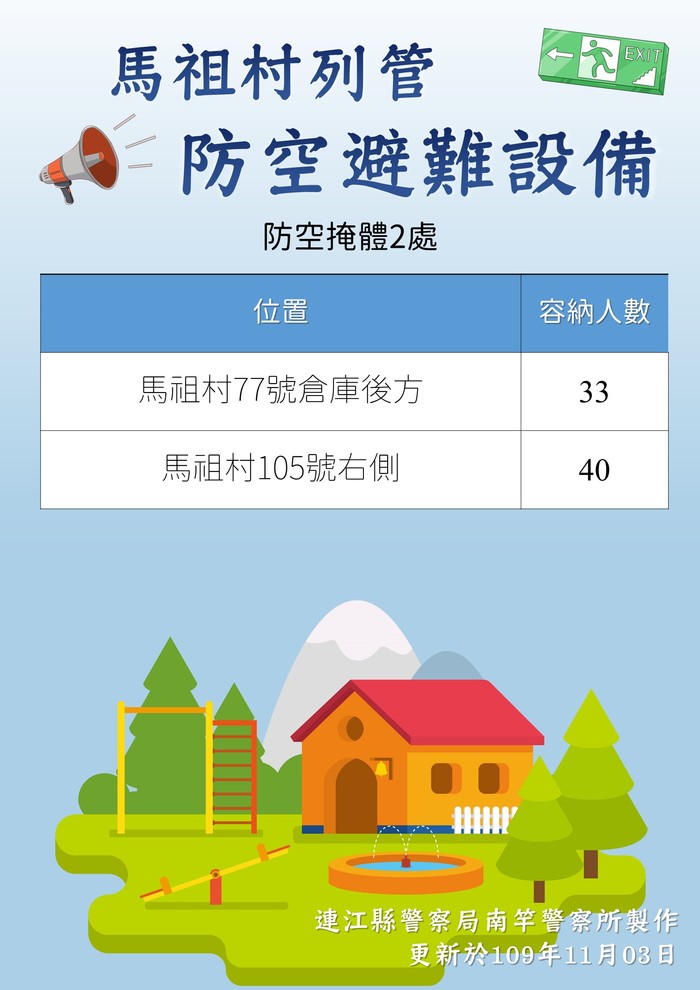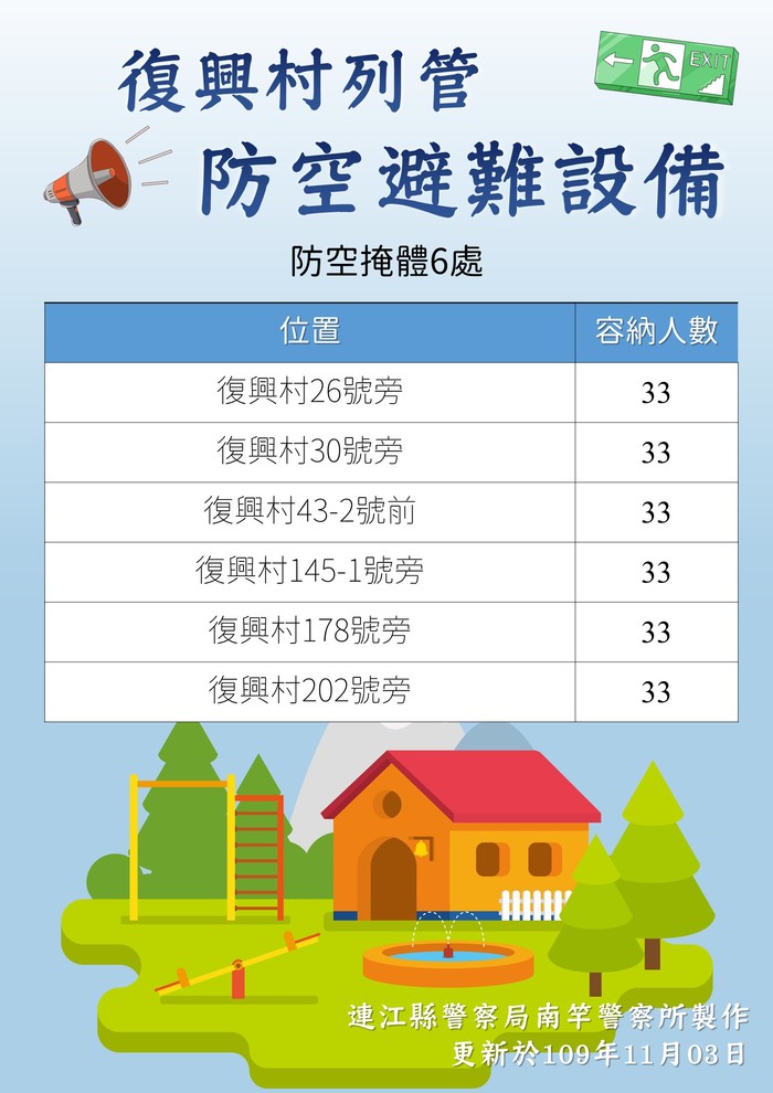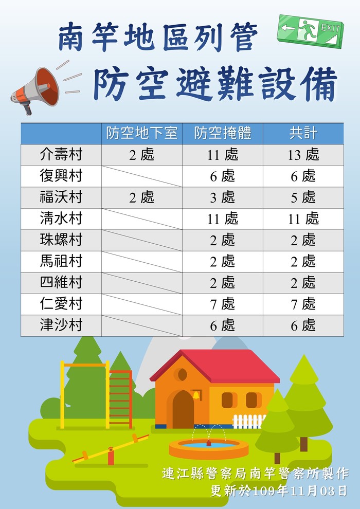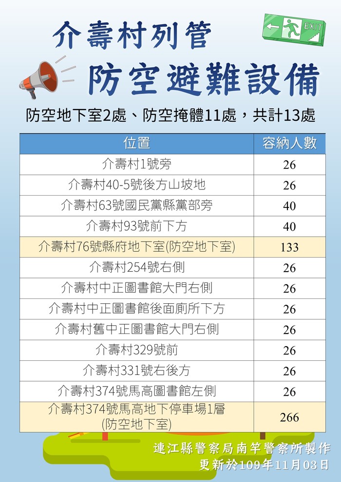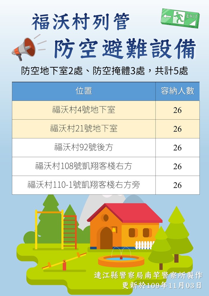 南警所提醒您:防空避難設備皆有黃色標誌牌,寫有總容量、配置等資訊。