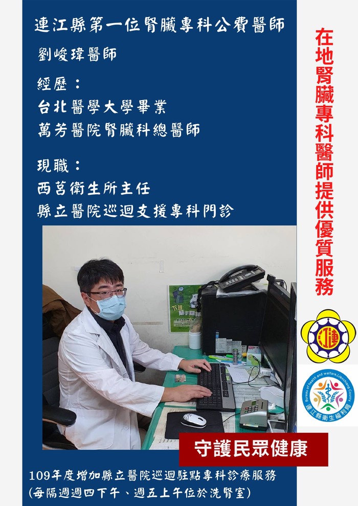 地區公費腎臟科劉峻瑋醫師支援縣醫 --閱讀人次 : 1608 劉峻瑋醫師為本縣第1位公費返鄉服務腎臟專科醫師,台北醫學大學醫學系畢業,萬芳醫院訓練完成並取得腎臟科專科醫師,現職為西莒衛生所醫師兼主任。