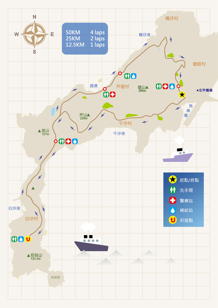 本屆賽道依舊延續以往,從北竿塘岐村迎賓館前廣場出發→中正路→中山路→北竿大道→坂里村→尼姑山小徑折返→北竿大道→環島北路→芹壁村→環島東路再回到北竿塘岐村迎賓館前廣場,賽道一圈總長為12.5公里,競賽組別有50公里的超級馬拉松組,4圈挑戰時間8小時,限制人數200人。25公里的超半程馬拉松組,2圈挑戰時間為4小時,限制人數500人。12.5公里的初階馬拉松組,1圈挑戰時間為2.5個小時,限制人數500人。及適合親子一起參加的3公里健康樂活組,限制人數300人。