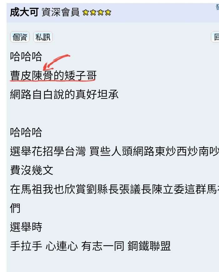成大可 wrote: 曹美女 隨便妳含血噴人 汙衊 濫罵吧! 哈哈哈 哇哇哇 呵呵呵 嘿嘿嘿曹皮陳骨 哪會是我呢? 我是馬祖少數不畏懼小雪餓勢力集團的男人