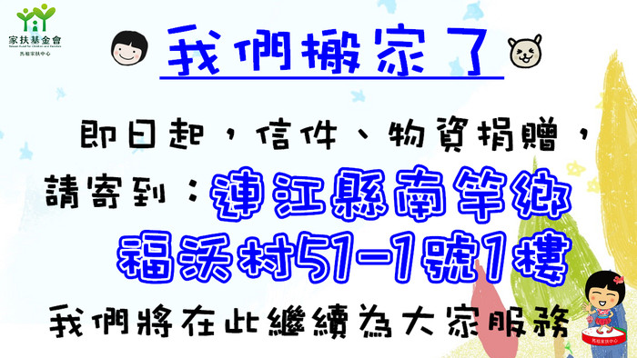 感謝各位鄉親夥伴長久來的支持,家扶即日起改至福澳村51-1號1樓服務(白日夢民宿和頂好特產店中間),持續服務馬祖的孩子,也希望在不久的未來復興村扶幼館能夠落成,屆時歡迎各位大朋友小朋友一起來家扶中心玩。
