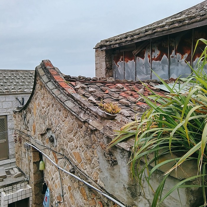 這些壓在瓦片上的石頭是為了避免風大而把瓦片掀開而放置!臺灣本島的老屋因為沒有強勁的海風和東北季風,少有這樣的景觀!