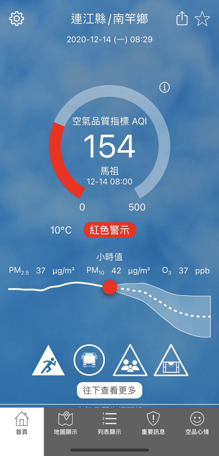 12/14空氣品質指標AQI 154 --閱讀人次 : 634 依據環保署今日(12月14日)上午08時空氣品質監測結果,馬祖地區受境外污染物影響,空氣品質指標AQI為154,對所有族群不健康,環境資源局提醒您