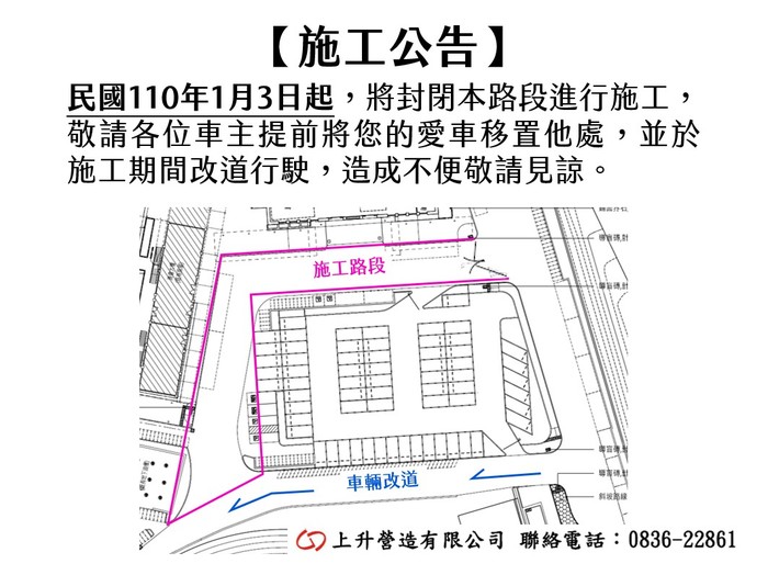 施工公告-自明國110年1月3日起,旅運大樓前道路將封閉路段進行施工,敬請各位用路人將愛車移置他處及改道行駛,造成不便敬請見諒。施工封部路線圖祥附件說明: