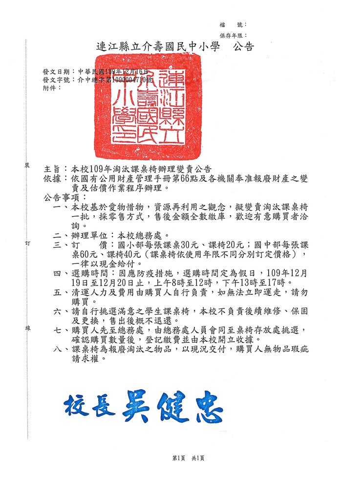 連江縣立介壽國民中小學109年淘汰課桌椅辦理變賣公告.pdf