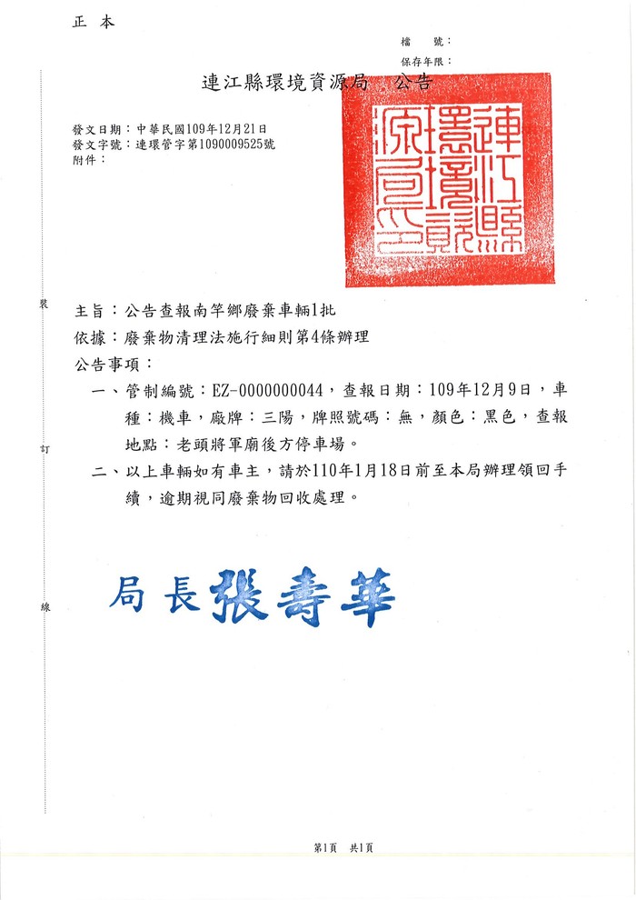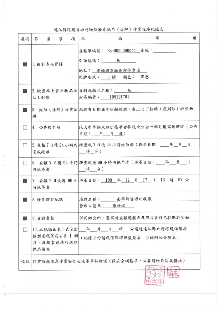 公告查報南竿鄉廢棄車輛1批