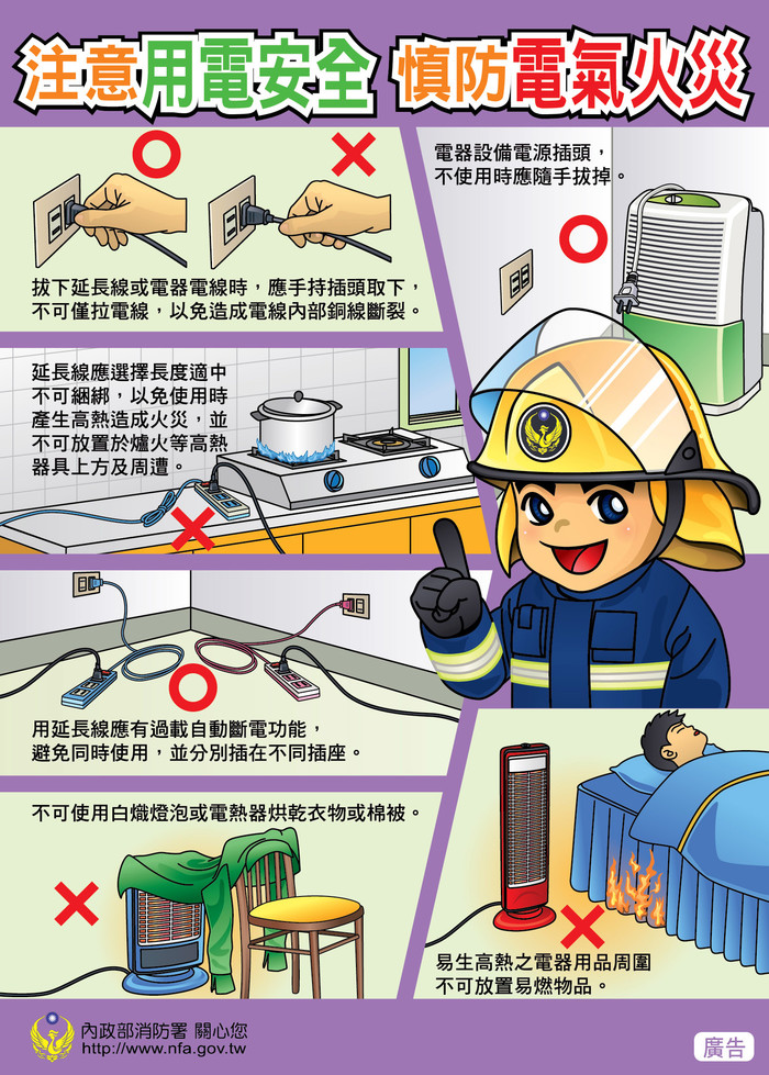 用電不超載、電線不折損、可燃物不擺放、插頭不用不插、沒有安全標章商品不買不用。像是延長線不可插接多個電器,電線外絕緣層不可受到擠壓、變形,電源周邊不要擺放可燃物品,沒有使用的電器插頭要記得拔掉
