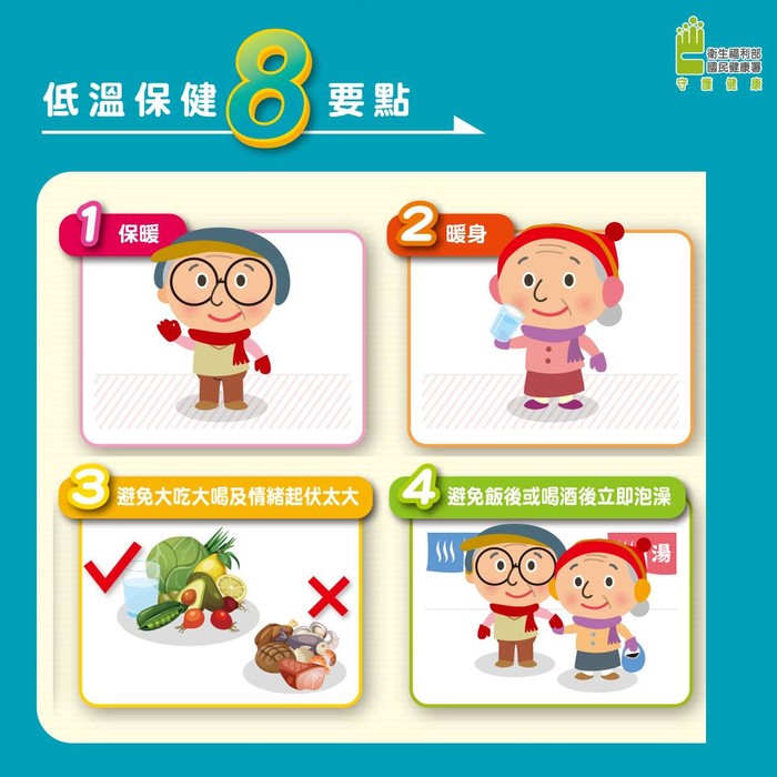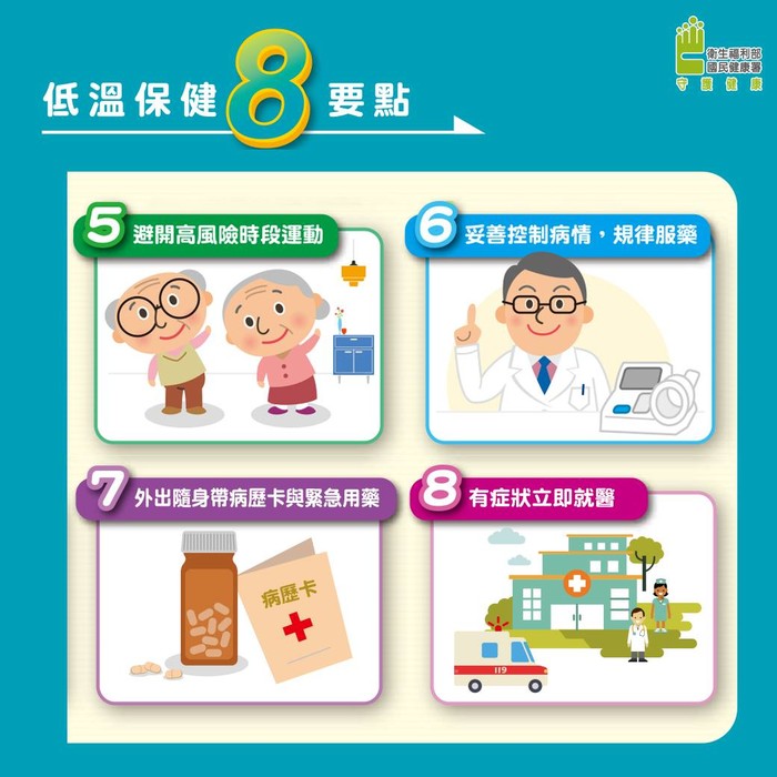 長輩及高風險民眾應特別注意三高控制、健康飲食、規律用藥、保暖措施及避免菸害,如果出現下列心臟病及中風徵兆,請立即就醫,爭取黃金搶救期: