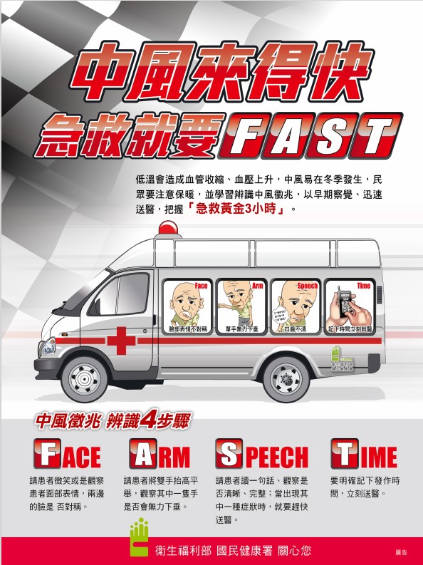 (二)中風徵兆:牢記FAST(快、快、快)中風口訣:「臉歪手垂大舌頭 記下時間快送醫」,用來辨識中風初期的重要症狀,把握黃金時間搶救急性中風: