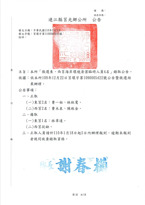 莒光鄉錄取海岸清潔臨時人員4名公告