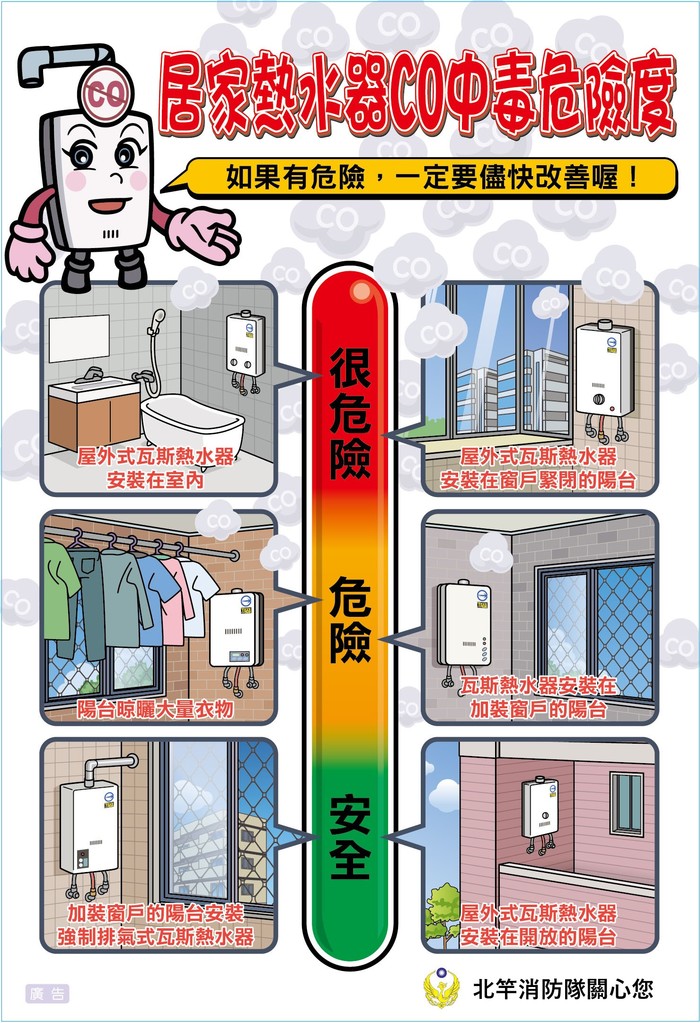 北竿消防分隊呼籲防範一氧化碳中毒宣導 --閱讀人次 : 583 消防局北竿消防分隊呼籲各位鄉親天氣寒冷,請各位鄉親一定要注意使用瓦斯熱水器安全事項,預防一氧化碳中毒情況: