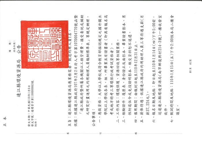 主旨:連江縣環境資源局應業務需要,甄選約用人員1名。