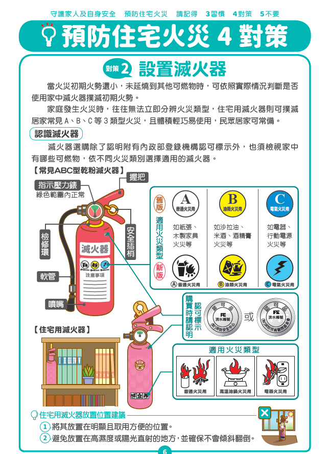 操作口訣:拉(插梢)→瞄(火源)→壓(把柄)→掃(向火源左右噴灑)