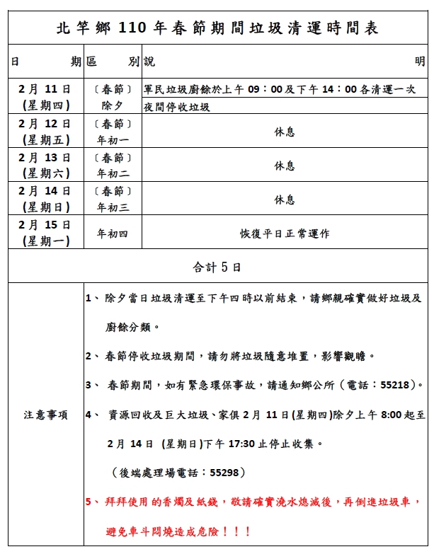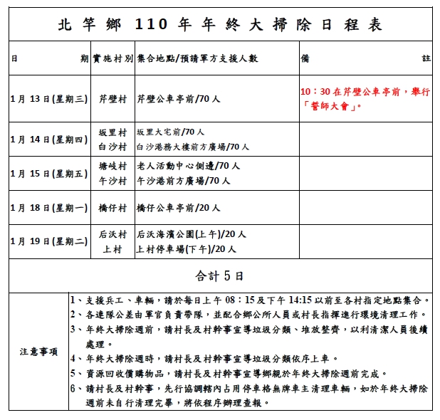 110年終大掃除實施日期由1月13日(星期三)至1月19日(星期二),煩請各位鄉親依照各村莊指定時間及地點將大型廢棄物、傢具進行收運作業。