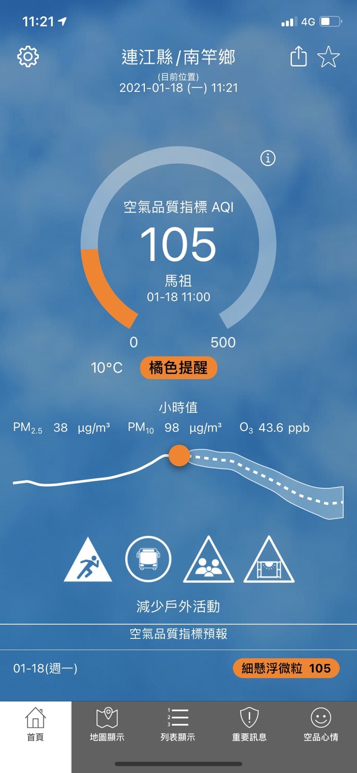 01/18品質指標AQI 105 --閱讀人次 : 494 依據環保署今日(01月18日)上午11時空氣品質監測結果,馬祖地區受境外污染物影響,空氣品質指標AQI為105,對敏感族群不健康,環境資源局提醒您