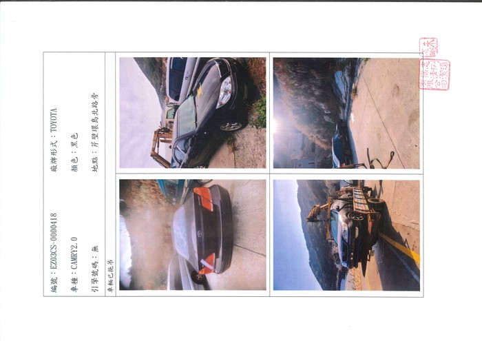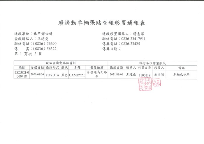 一.管制編號:EZ03C3-0000418,查報日期:110年1月6日,廠牌:TOYOTA,顏色:黑,車種:CAMRY2.0,牌照號碼:無,查報地點:北竿鄉芹壁環島北路旁。