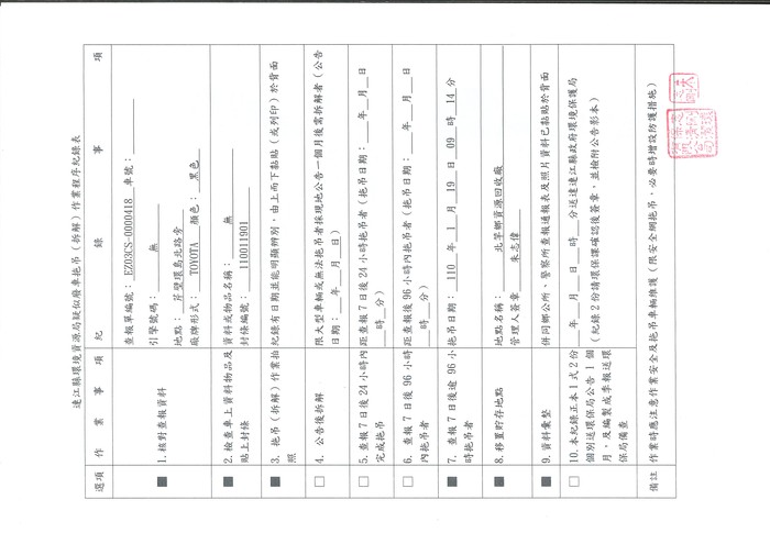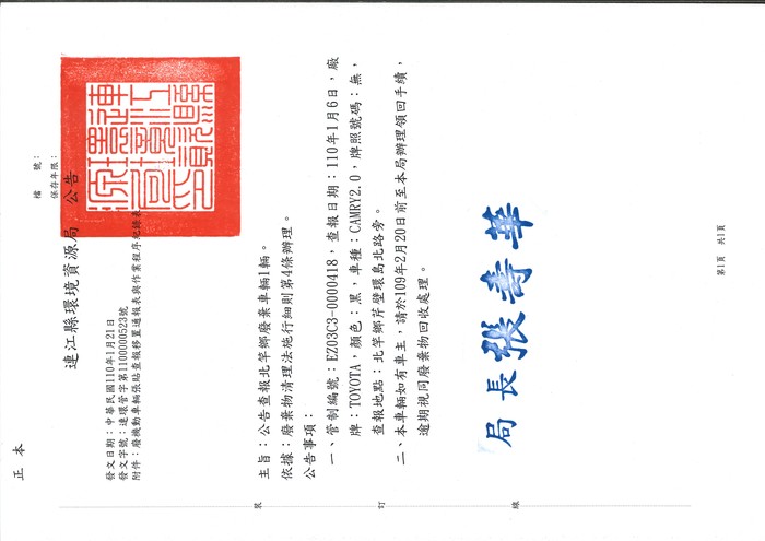 二.本車輛如有車主,請於109年2月20日前至本局辦理領回手續,逾期視同廢棄物回收處理。