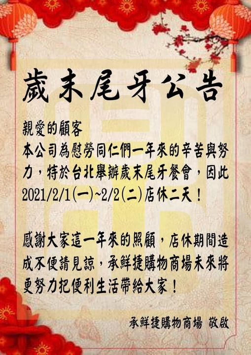 承鮮捷尾牙店休公告