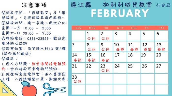 **因應疫情期間,請大家留意來訪時需配戴口罩;因教室空間較小,每時段至多開放2組家庭使用