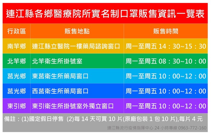 各鄉醫療院所實名制口罩販售資訊一覽表