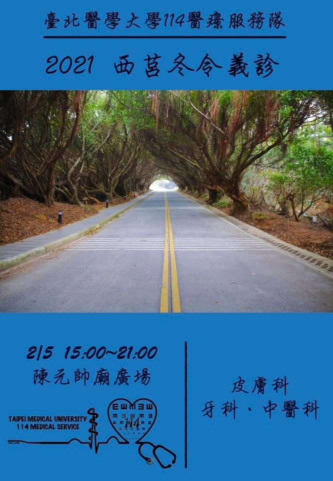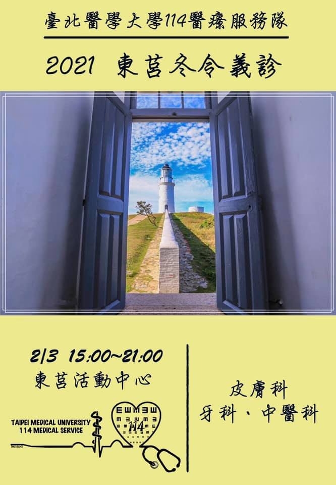 北醫114醫療服務隊2021冬令義診巡迴服務又來了,今年義診的科別以鄉親需求較高的牙科及眼科等為主。2月3日在東莒有牙科、中醫、皮膚科,有需要的鄉親可前往指定場所掛號看診。
