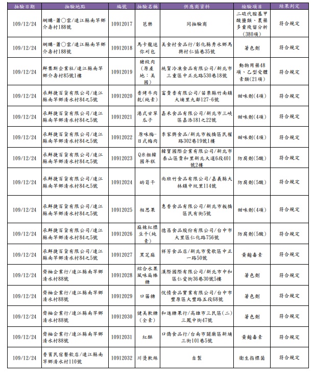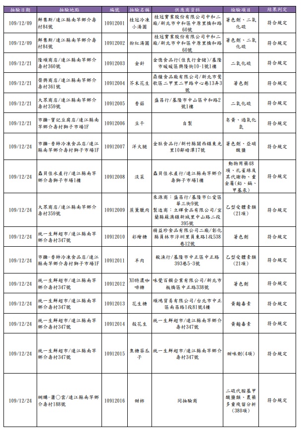 110年年節食品抽驗結果均符合規定 --閱讀人次 : 548 農曆年節將至,為確保民眾食用年節食品衛生安全,讓縣民能吃得安心,衛福局日前於傳統市場、超市、賣場等場所進行年節食品抽驗及標示查核,共計抽驗32件產品,包括蔬果、羊肉及肉加工品、淡菜、金針、年糕、休閒食品(瓜子、堅果、蜜餞、糖果)等各種年節食品及年菜,檢驗農藥殘留、防腐劑、著色劑、甜味劑、二氧化硫、過氧化氫、黃麴毒素、衛生指標菌等項目,檢驗結果均符合規定(詳如附件抽驗結果清冊),並針對其中21件包裝食品進行標示查核,結果與規定相符。