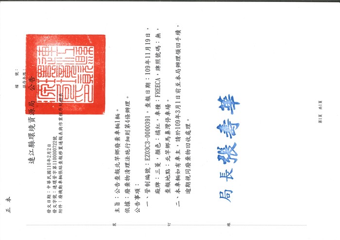 二、本車輛如有車主,請於109年3月日前至本局辦理領回手續,逾期視同廢棄物回收處理。