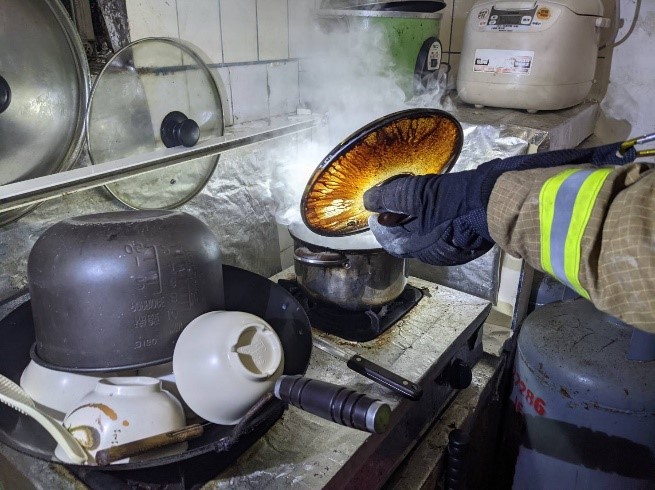 於110年01月本縣某民宅險些發生火警,當日晚間屋主因工作在外忙碌了一整天,返家後拖著疲憊的身軀在一樓廚房烹煮食材,因身體太過勞累,且預估食材煮好尚需一些時間,所以回房間打算休息一下,卻不知不覺睡著了,導致瓦斯爐持續運作烹煮食材,造成食物及鍋子內食物燒成焦碳並產生有大量煙霧,周邊住戶發現該屋有大量焦味及煙霧竄出,立即撥打119報案,消防分隊人員達到現場後,立即進入屋內察看及佈置水線準備入屋搶救,發現廚房內爐火持續烹煮,立即關閉爐火制止鍋爐持續燃燒,並叫醒熟睡屋主至屋外避難,所幸周邊住戶發現即時,避免了一場火災案件發生。