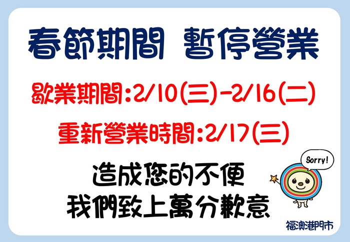 本門市春節期間暫停營業,2/7是最後一次10%回饋,請把握機會喔!