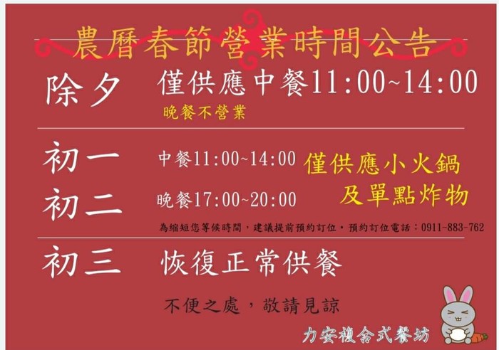 除夕僅供應中餐(11:00–14:00)