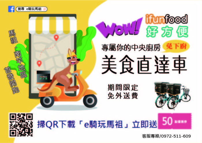 經過各方努力協調,外送平台「i fun food好方便」終於要在馬祖南竿正式推出了。試營運期間為2021/3/1~3/31,服務時間為:每日早上9點~下午5點。