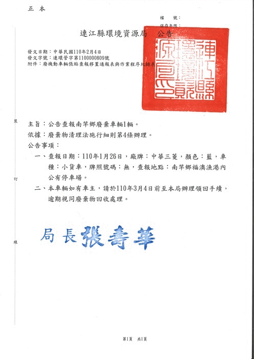 公告查報南竿鄉廢棄車輛1輛 --閱讀人次 : 770 主旨:公告查報南竿鄉廢棄車輛1輛。