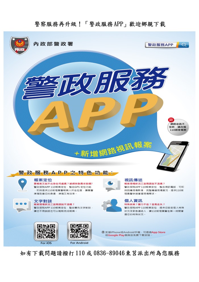 東莒派出所警政服務APP下載宣導 --閱讀人次 : 566 歡迎民眾下載「警政服務App」,並善用「網路視訊報案」功能。