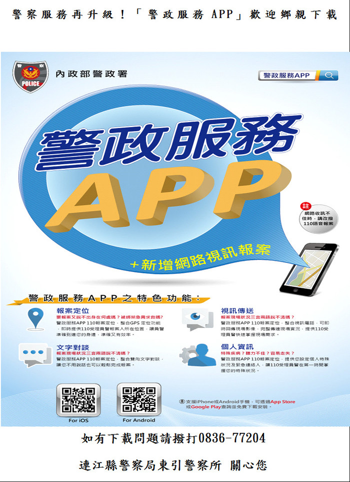 東引警察所警政服務APP下載宣導 --閱讀人次 : 463 歡迎民眾下載「警政服務App」,並善用「網路視訊報案」功能。