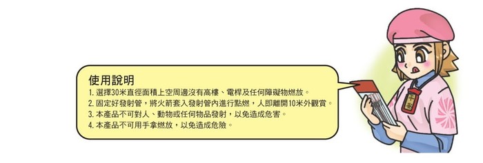 3.未滿12歲之兒童應由父母陪同施放,且不得施放飛行類、升空類及摔炮類之產品。