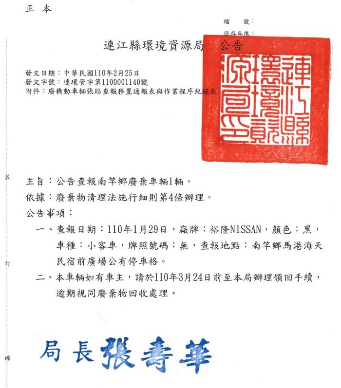 公告查報南竿鄉廢棄車輛1輛 --閱讀人次 : 628 主旨:公告查報南竿鄉廢棄車輛1輛。