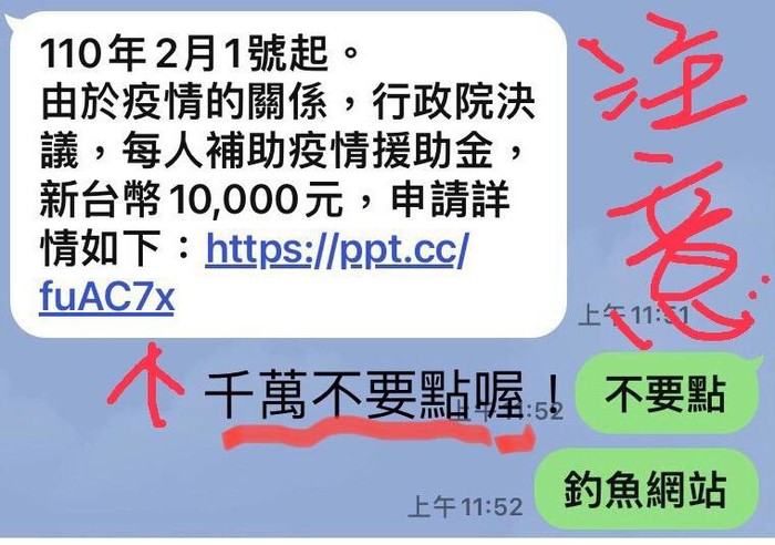 假冒來自政府的電子郵件,看起來就像是政府的某個部門提供的紓困金,郵件內含網頁連接提醒人們提高警覺,不要讓犯罪者利用人們對新冠病毒帶來的財務擔憂進行詐騙。也能避免誤點惡意連結。