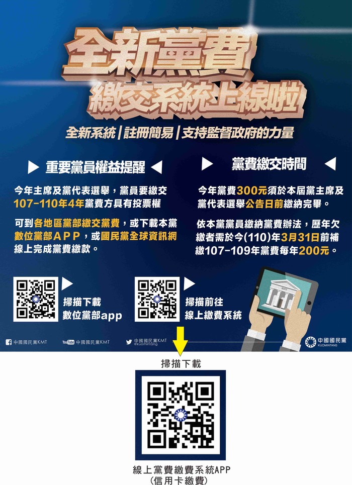 中國國民黨預定今(110)年年中將舉行黨主席及黨代表選舉,組發會特別提醒,黨員要繳齊107年至110年、共4年的黨費才具有投票權,繳費時間及金額說明如下: