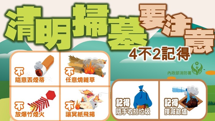 「記得」撲滅餘燼-離開墓地時別忘了仔細檢查是否有未熄滅的火源,請妥善運用水源將餘火澆熄後再離去,切勿因一時的不察、大意而造成無法挽回的後果。
