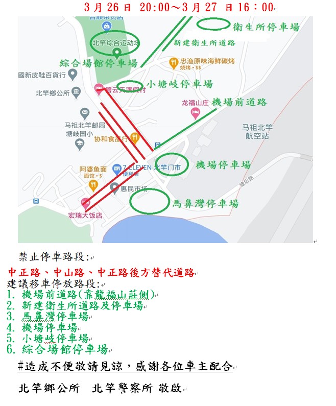 為配合3/27日北竿硬地馬拉松賽事,協請各位鄉親暫時將您的愛車配合移動。