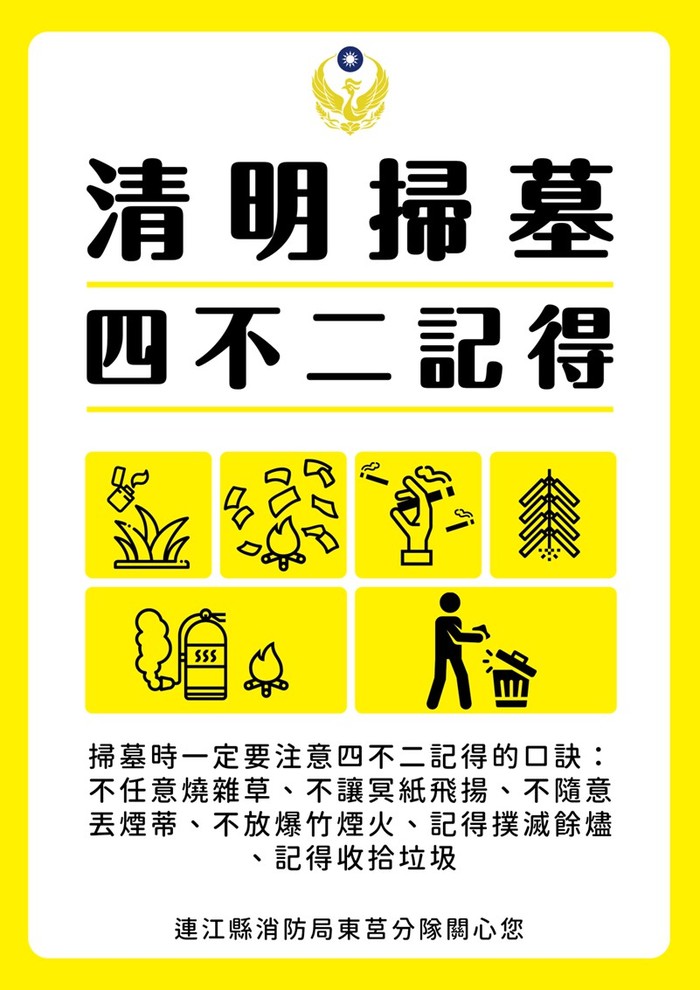 東莒消防分隊:清明防火宣導 --閱讀人次 : 510 清明防火牢記「4不2記得」口訣: