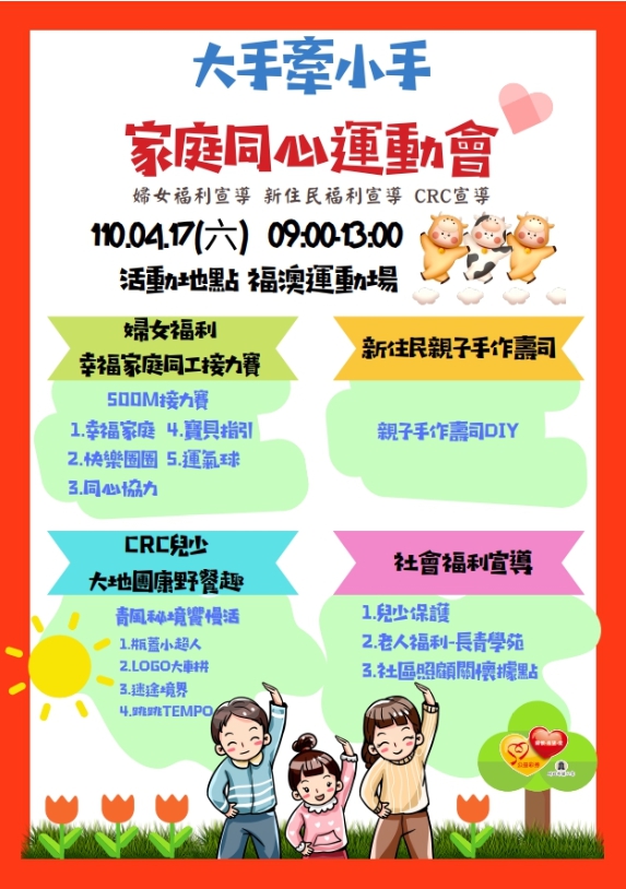 衛福局~大手牽小手運動會~即將登場~ --閱讀人次 : 963 一、活動名稱:大手牽小手家庭同心運動會