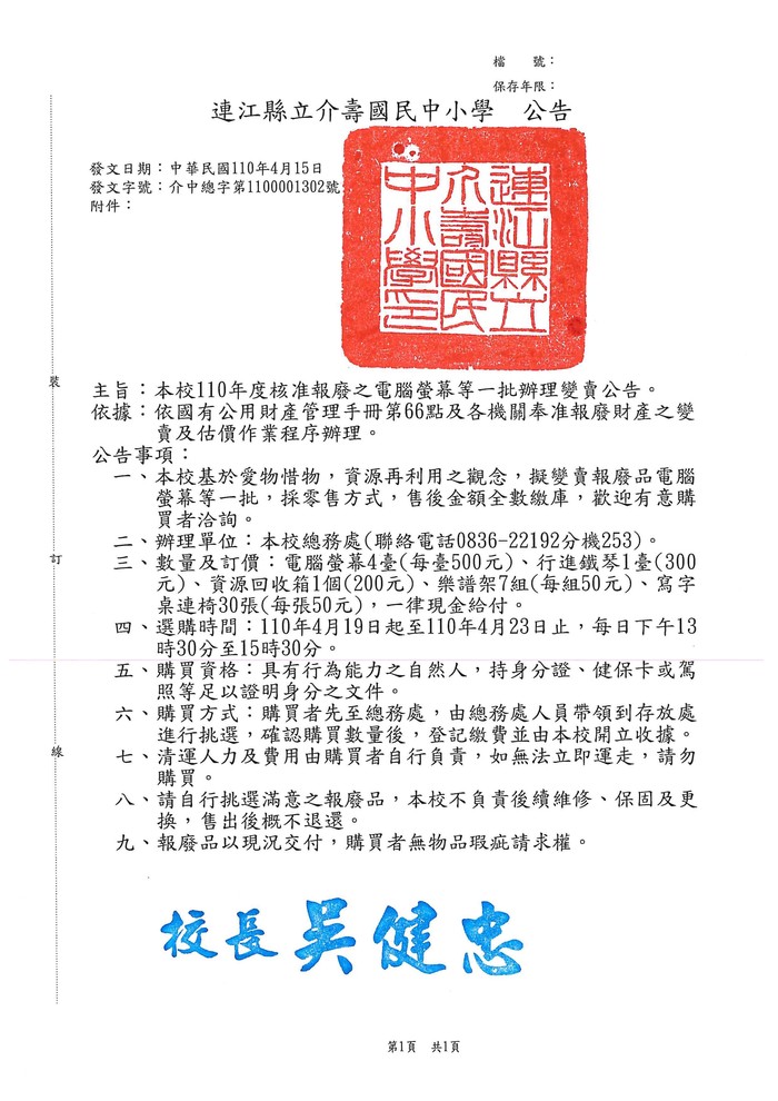 連江縣立介壽國民中小學110年度核准報廢之電腦螢幕等一批辦理變賣公告