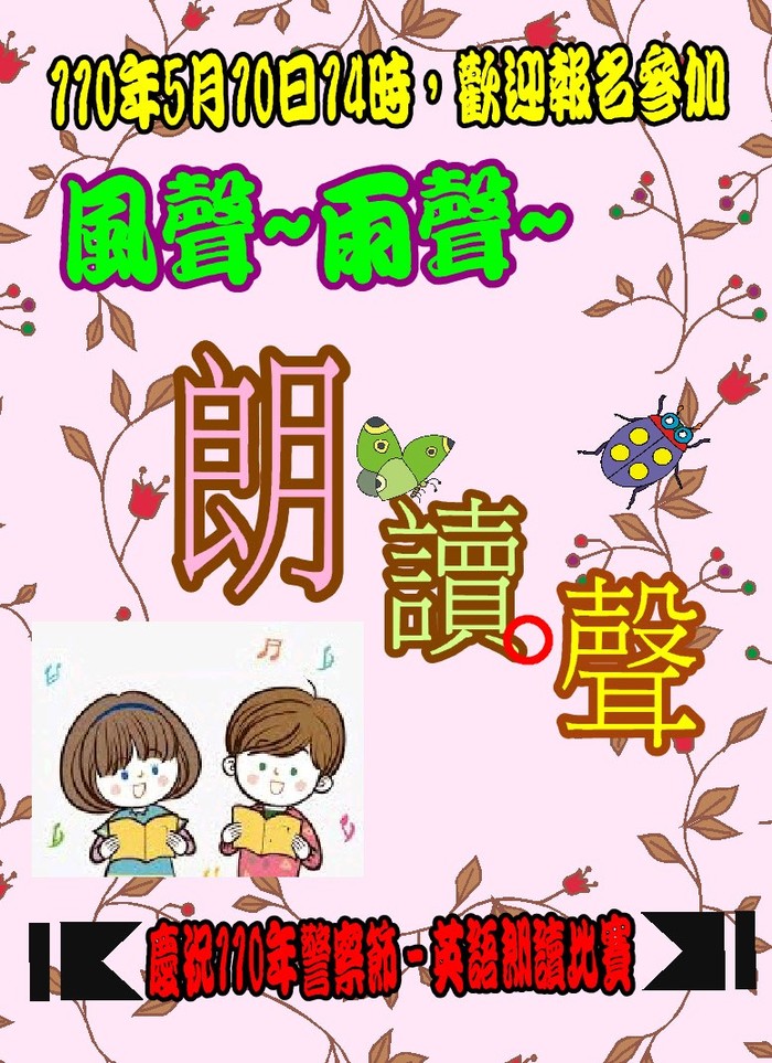 縣警局慶祝警察節-英語朗讀比賽 --閱讀人次 : 1542 一、 活動目的:為培養警民合作精神,促進警民和諧氣氛,以嶄新方式辦理犯罪預防宣導,以多元辦法倡導交通安全,增進身心健康,激勵工作士氣,並提昇同仁英語能力,故舉辦對外開放報名之英語朗讀比賽,除此之外,本次活動亦邀集各公務單位、地方民眾與本局同仁共襄盛舉,透過警民互動及合作,讓大家了解英文的重要,增益英文學習的樂趣,並在競賽活動間活絡警民關係,塑造警察良好形象,提升民眾對警察機關之滿意度及整體印象。