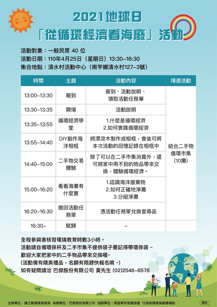 2021地球日「從循環經濟看海廢」活動 --閱讀人次 : 1035 想了解什麼是循環經濟嗎?想動手化廢為寶嗎?想體驗一場具有教育意涵的淨灘嗎?