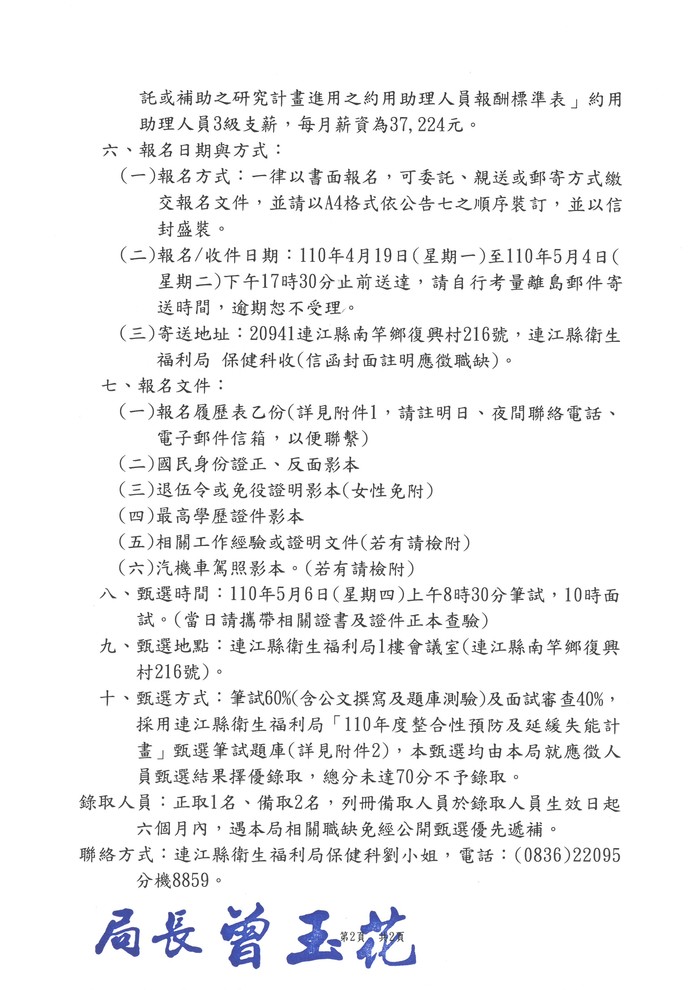 方式:親自或郵寄馬祖南竿鄉復興村216號(連江縣衛福局保健科)