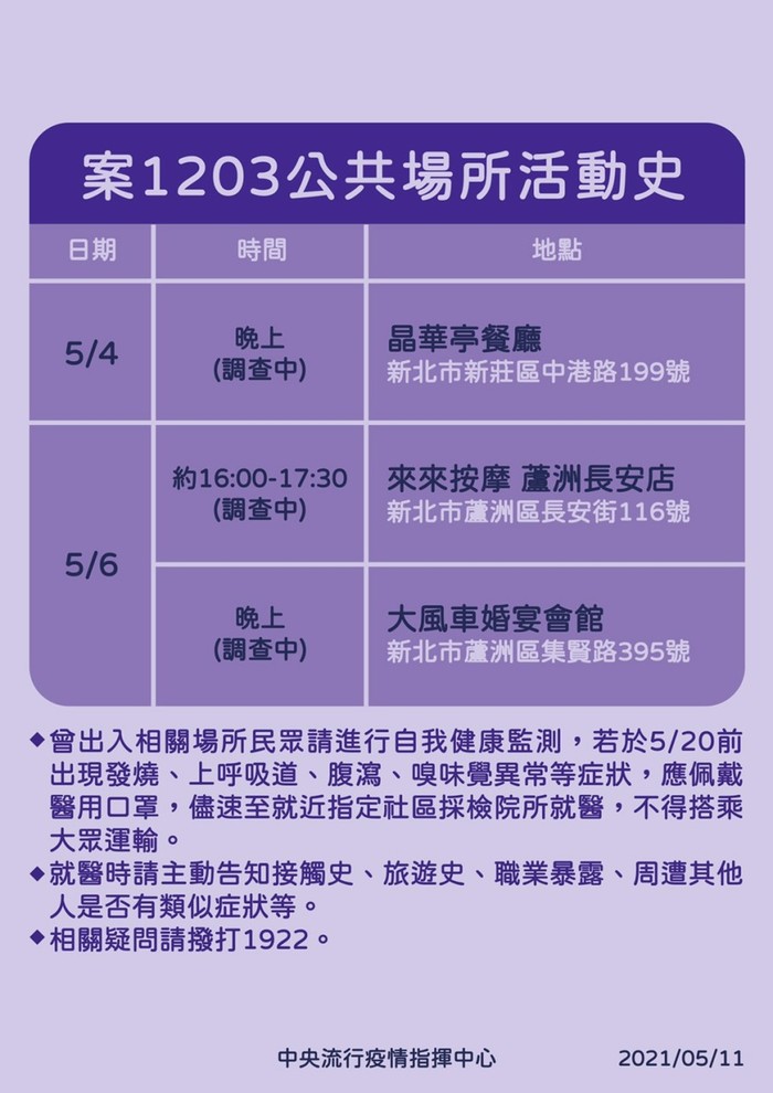 案1203為本國籍60多歲男性,近期無出國史,5月7日出現疲倦、咳嗽、畏寒等情形,5月9日因發燒至醫院就醫採檢,於今日確診(Ct值18);感染源待釐清。已初步掌握個案接觸者115人,列居家隔離,其他接觸者持續調查匡列中。
