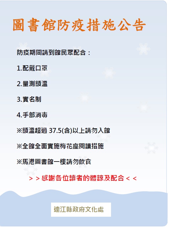 防疫期間請到館民眾配合:1.配戴口罩2.量測額溫3.實名制4.手部消毒