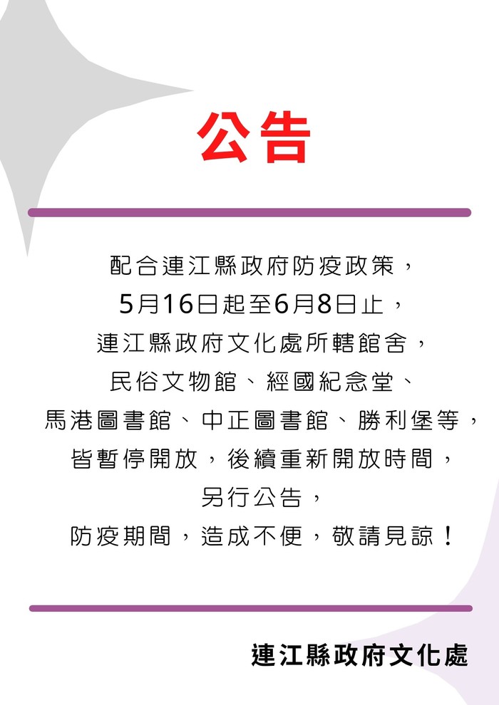 配合連江縣政府防疫政策,5月16日起至6月8日止,
