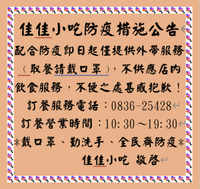 佳佳小吃防疫措施公告,即日起僅提供外帶